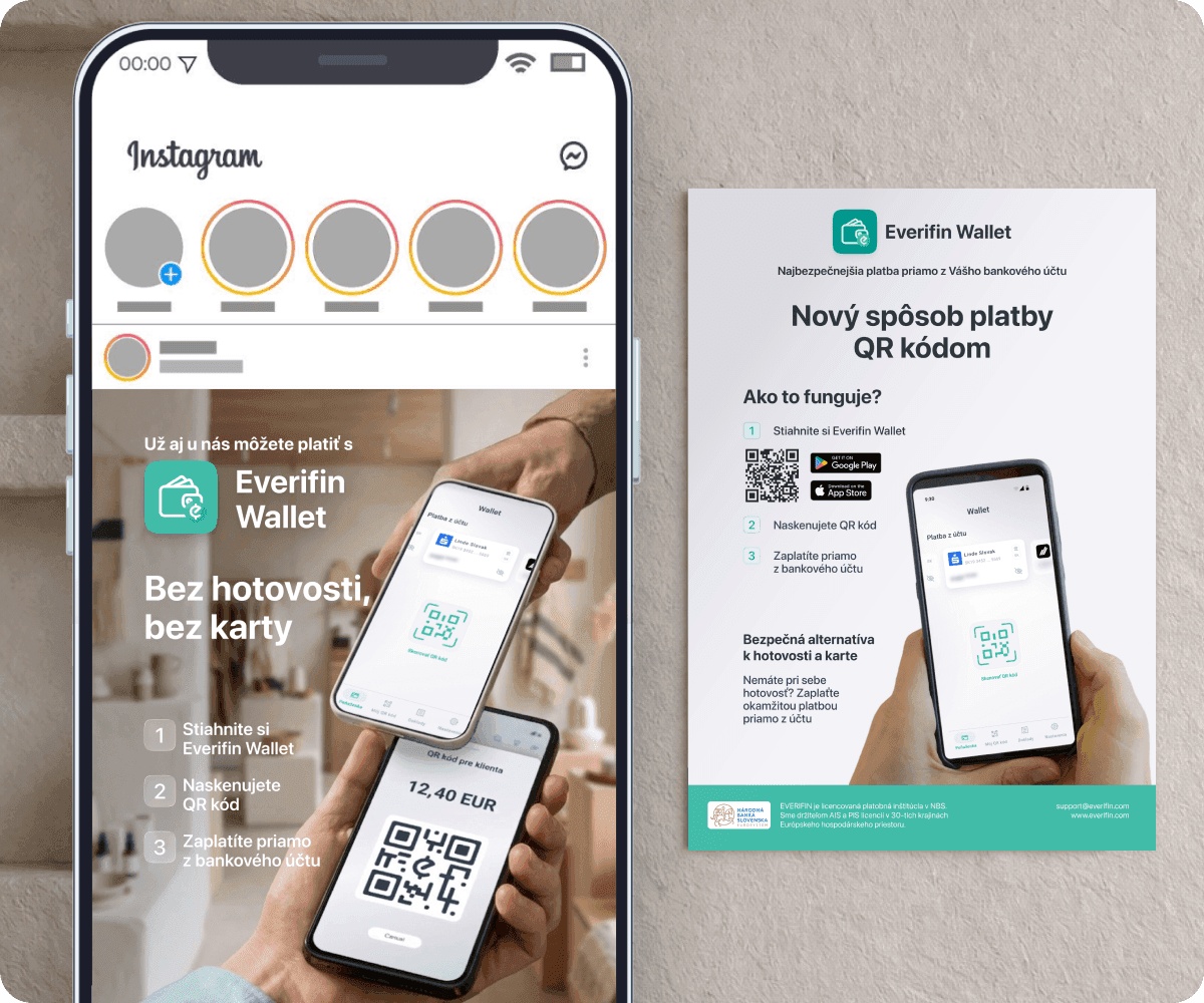 Ukážte zákazníkom, že u vás môžu platiť jednoducho cez EVERIFIN Wallet. V balíku nájdete: Príspevky na sociálne siete pripravené na okamžité použitie, leták do prevádzky, nálepku na dvere. Všetko bez potreby dizajnu alebo úprav - stačí použiť.